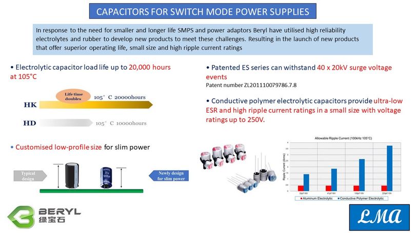 Solid conductive polymer electrolytic capacitors offer major advantages over standard Aluminium electrolytic products. Ripple current ratings are up to 10 times higher, ESR is significantly lower and operating life considerably longer. Beryl offer market leading solutions in capacitance values from 3.3µF - 1500µF with voltage ratings up to 250V. Full details can be found at Solid Conductive Polymer Capacitors - Beryl (zq-beryl.com) or check out the Polymer Electrolytic capacitor short form guide below.